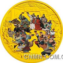 纪念金币上整幅图以刻画齐聚忠义堂各具性格的梁山好汉为主线,他们或精灵,或粗鲁,或淳朴,或风流,果然识性同居;他们或笔,或刀,或枪,或骗,可谓各有专长,随才器使。虽然他们的性格各不相同,但在饮酒这一点上,却是如此一致。以酒会友,他们人手一个大酒碗,有的斯文慢品,有的豪放暴饮,有的难舍最后一滴,更有人借酒赋诗抒怀。形态各异,栩栩如生。