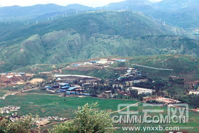 在大丽路上俯瞰北衙矿区,蓝色屋顶区域是冶炼车间,左边是采矿区。