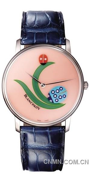 宝珀Villeret 超薄腕表 刻度盘为粉红蛋白石。红色瓢虫头为缟玛瑙,身体为红珊瑚,青色瓢虫头为青金石与蛋白石,身体为绿松石与青金石。叶子为绿瑀。限量发行1枚。