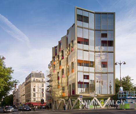 中国有色网·赏鉴频道讯 法国工作室[BP] Architectures设计的这座公寓兼画廊建筑(Housing and gallery)面对着巴黎的巴士底狱广场(Place de la Bastille),公寓表面由金色的铝板组成。当一些立面上的铝板打开时,会露出里面房间各种颜色的窗户框架。一间画廊占据了首层全玻璃幕墙的空间,有趣的锯齿形混凝土柱子在玻璃的外围支撑着建筑。建筑虽然只有仅仅15个单元 ,八大复式公寓的凉廊在玻璃百叶窗后形成了窗帘和抽象的垂直屏障。建筑对光线变化高度敏感,材料的金属性与表面变化相结合,加强了颜色的对比和相互转换。短短的几秒钟铝幕墙可以由芥末黄色转变为金色。