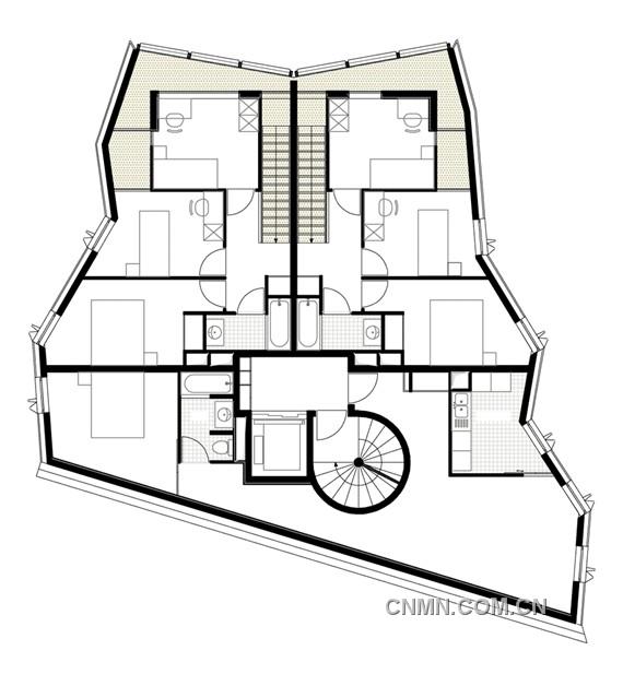 设计师把梯形用地做了最合理的规划利用,巴士底狱广场公寓紧靠着毗邻的建筑,然后逐渐向前收,形成优美的竖向轮廓。外墙身着电镀金色铝板,铝板使得立面转角得以缓解,同时和光线做了一次游戏。