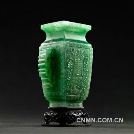 翡翠雕福寿纹螭龙耳四方瓶 日本山中商会于1942年在北京前门购得,有当时的发票作为佐证。