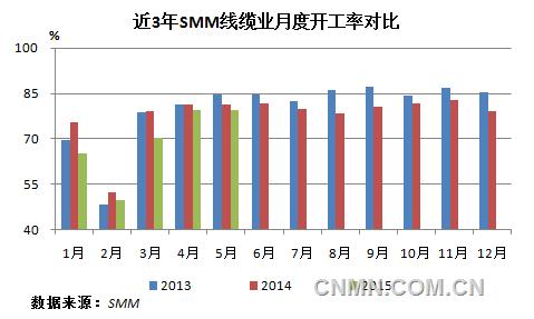 而从SMM线缆业开工率调研结果看,可见2015年各月度开工水平均低于此前两年的同期数值。作为占居国内铜消费50%的行业,线缆业的上述现象直接拖累实体铜需求增长,尽管传统的二季度消费旺季仍相对存在。