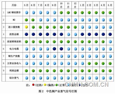 从中色铜产业景气信号灯可见(见图2),在构成中色铜产业景气指数的9个指标中: LME铜结算价、主营业务收入、利润总额位于“正常区间”;M2、进口量指数、房屋销售面积、电力电缆、铜生产指数位于“偏冷”区间;投资总额位于“过冷”区间。从景气信号灯变化可以看出,房地产调控措施效果有所显现,房屋销售面积已由“正常区间”转向“偏冷区间”。