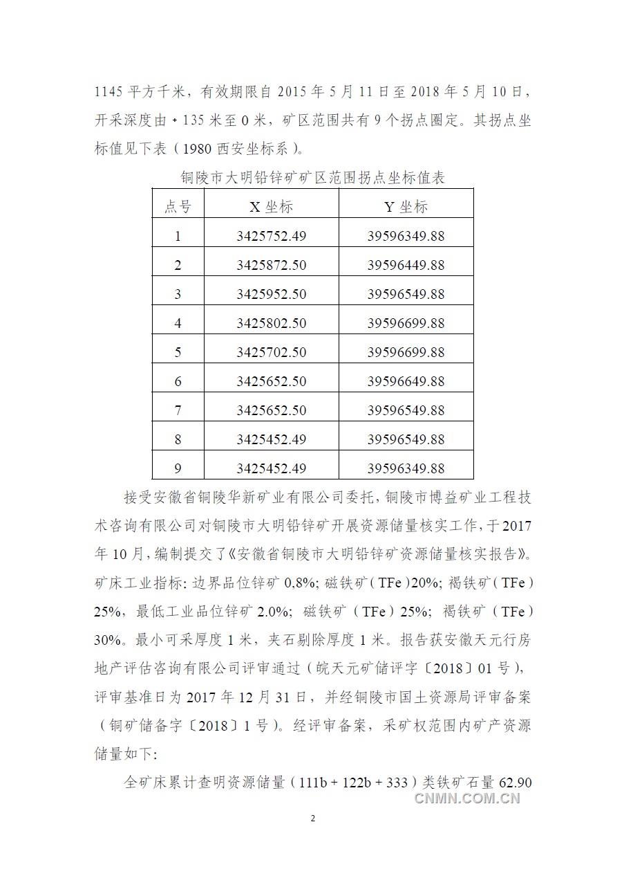 附件:《安徽省铜陵市大明铅锌矿矿产资源开发利用方案》审查意见书