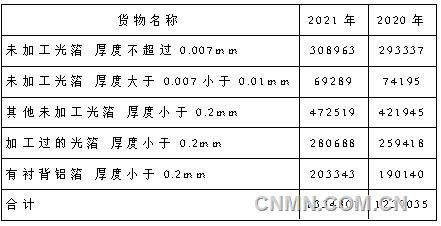 根据海关数据显示,2021年1月—12月中国铝箔出口量133.5万吨,同比增长7.73%,出口量超过此前2019年的最高值129.5万吨,创历史最高水平。全年铝箔出口额51.42亿美元,同比增长34.2%,同创历史新高,此前最高水平是2018年的43.04亿美元。2021年铝箔出口额占中国铝产品出口额的14.8%。