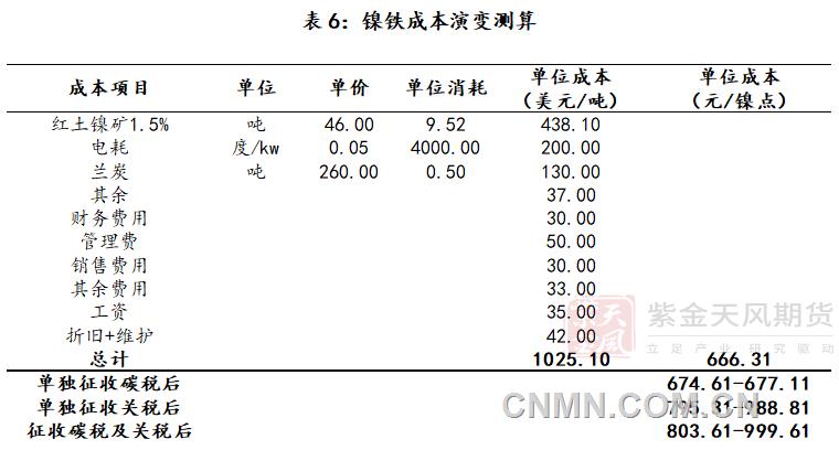 印尼镍产品在全球镍元素总量供给中起到举足轻重的作用,其成本变化也对镍产品成本中枢至关重要。无论是征收关税还是碳税,都将抬升印尼镍产品的成本,我们认为随着印尼政策逐渐出台,相关镍产品的价格可能随之上涨,但涨幅有限。