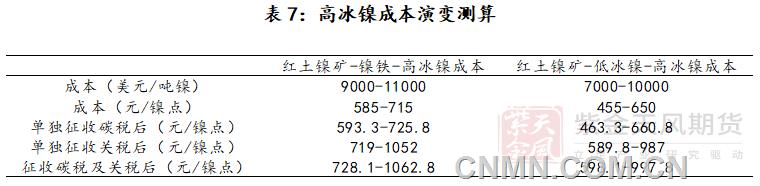 征收碳税对镍铁和高冰镍成本抬升约8.3-10.8元/镍点,对MHP影响相对较小。