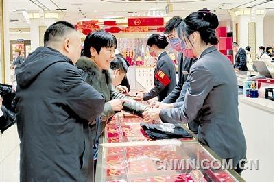 2月5日,位于北京市西城区某商场的黄金商铺,顾客人头攒动,男女老少穿行于各柜台,仔细向营业员询问黄金饰品的情况。